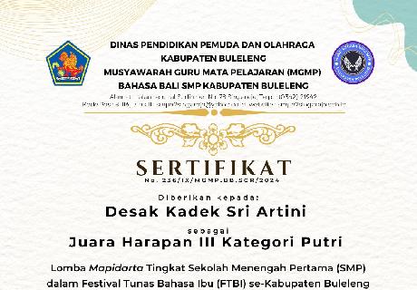 Prestasi membanggakan kembali diraih oleh salah satu peserta didik SMP Negeri 5 Busungbiu, dimana pada kesempatan ini prestasi ini diraih oleh Siswi atas nama Desak Kadek Sri Artini, Siswi Kelas VIII A. Adapun prestasi yang diraih sebagai Juara Harapan III Mapidarta Tingkat Kabupaten Bueleleng jenjang SMP. Lomba ini dilaksanakan dalam rangka Festival Tunas Bahasa Ibu ( FTBI ) Tahun...